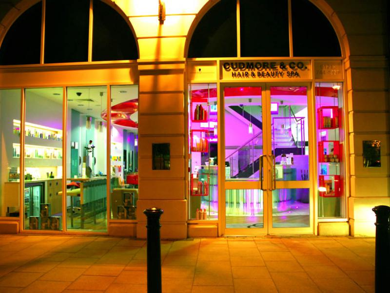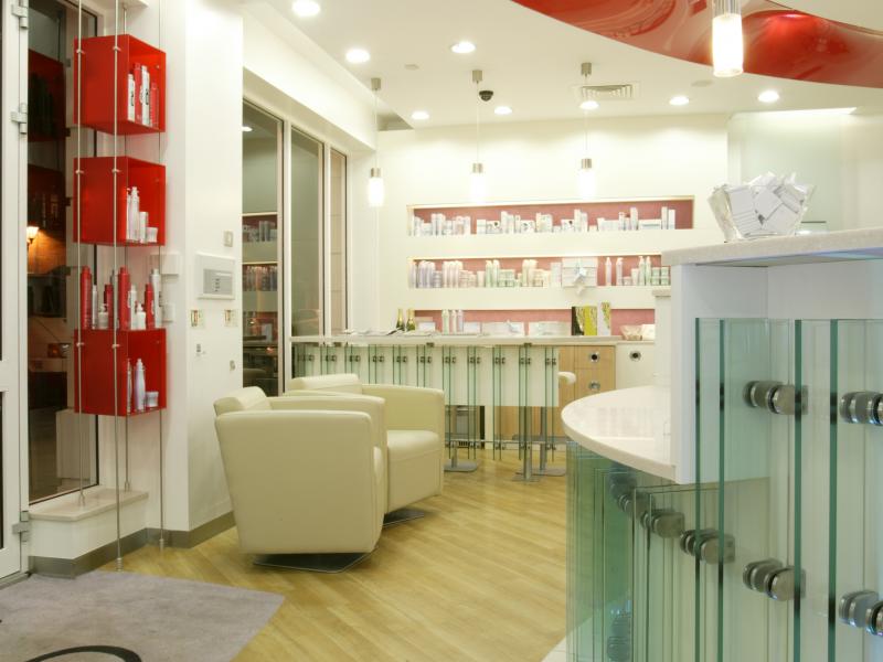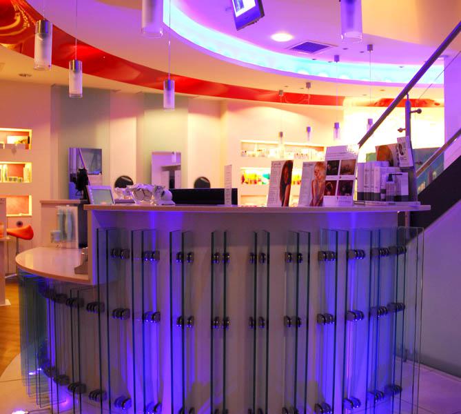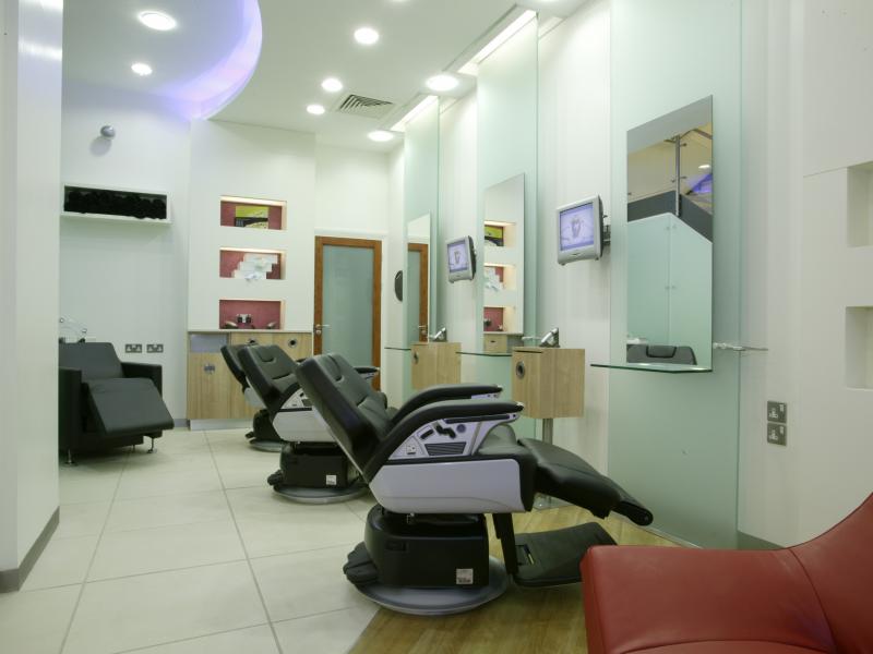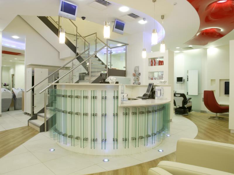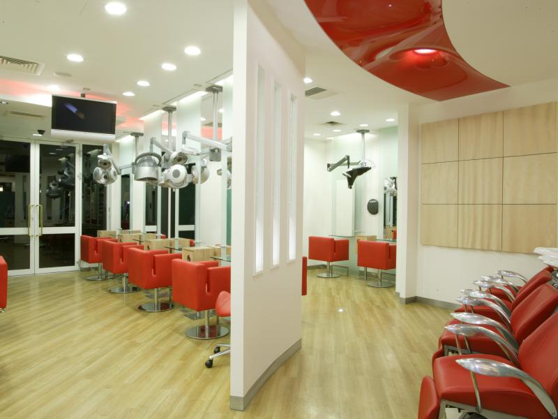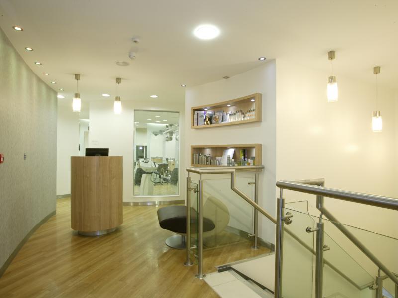 Curved walls, varying levels of ceiling, 3m glass panels, pillar box red features and colour changing lights add to the dramatic effect. A band of fire retardant stretch ceiling circling the central staircase links the reception area to the ladies hairdressing and backwashes. The salon also boasts a Gents area with boy’s toys, fully reclining barber’s chairs, complementary beer fridge and individual television monitors.