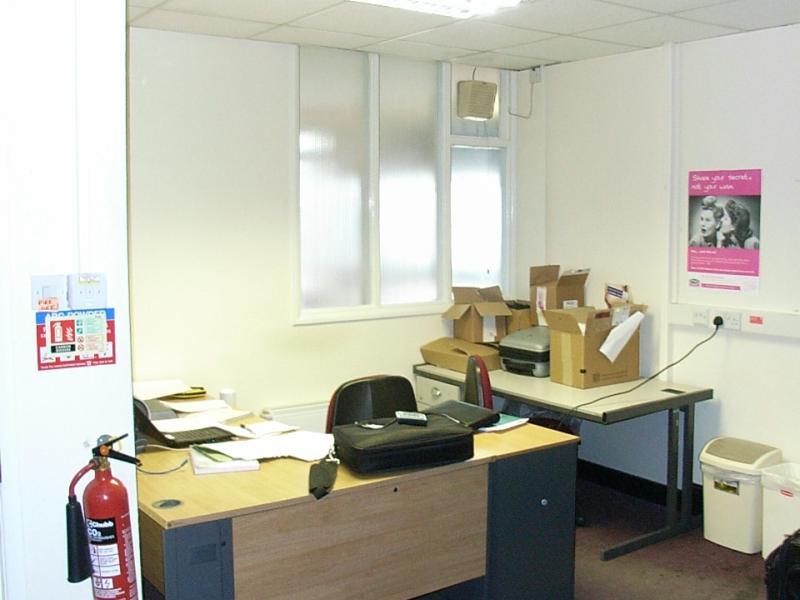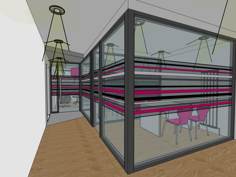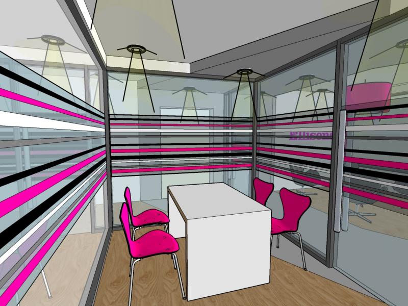 A blast of bright pink taken from the re-branding is integrated into the new scheme through the fabric material in the office and reception chairs, the large feature lampshade suspended above the reception / telephone point and the company signage. The two-tone grey floor reflects the bulkhead ceiling detail and acts as a path towards the glass lobby doorway controlled by an electronic switch.