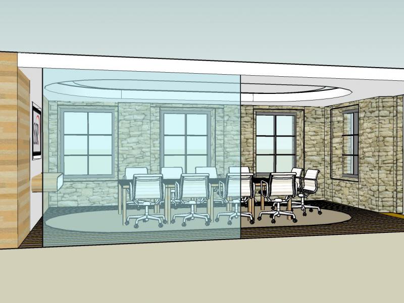 Several meeting areas and rooms were designed to accentuate the existing timber beams with a vibrant and well thought-out set of finishes which included broadloom carpet, suspended bespoke lampshades and concealed lighting. In particular, recessed and pop up plasma screens within cabinets, timber wall paneling, angled glass panels and bespoke tables were designed to emphasize the quality and creativity of the finishes