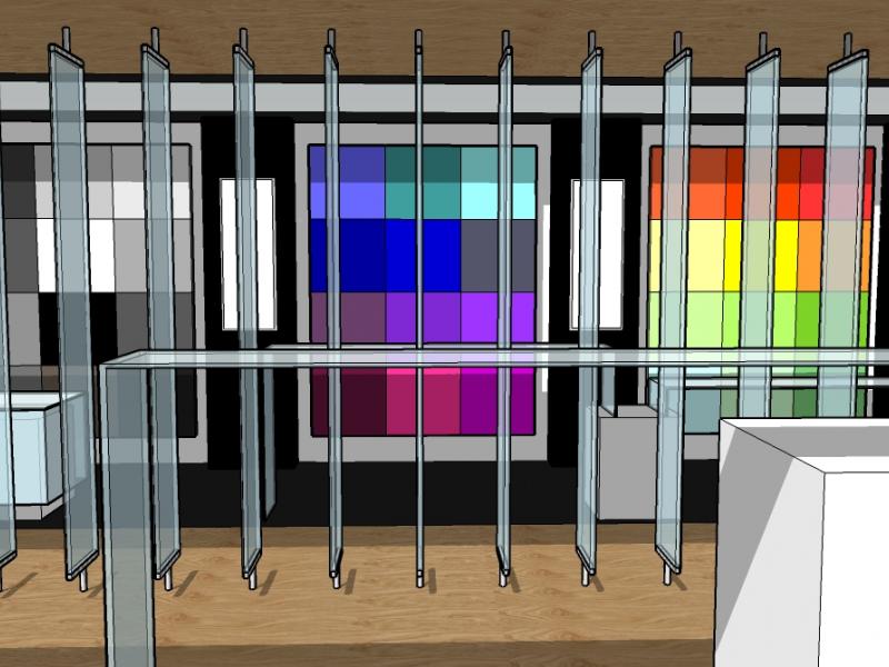 The interior of black, opaque white stretch ceilings and oak paneling, enabled a crisp and unconventional look to be developed whilst highlighting the glass as works of art. Various types of lighting were considered (back, edge, spots, fluorescent, LED, etc) to emphasize uses in residential and commercial applications